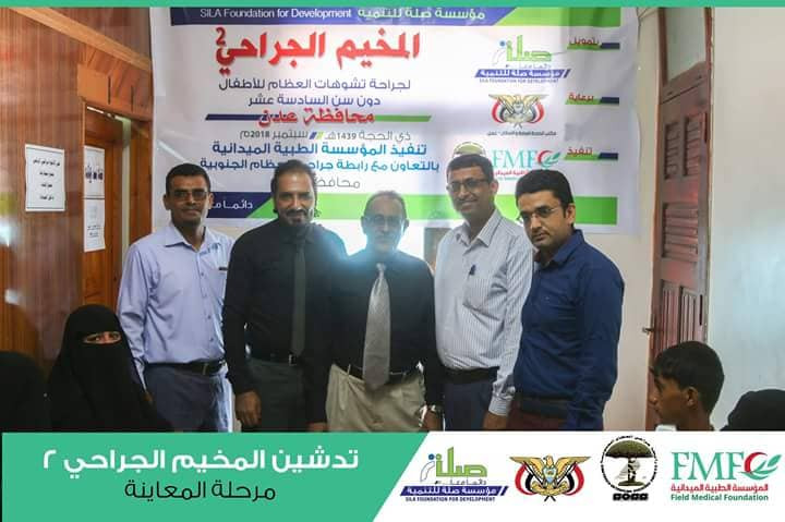 بتمويل من مؤسسة صلة للتنمية و رعاية مكتب الصحة العامة و السكان محافظة عدن دشنت المؤسسة الطبية الميدانية بالتعاون مع رابطة جراحي العظام الجنوبية المخيم الجراحي الثاني لجراحة تشوهات العظام لدى الأطفال دون سن السادسة عشر في مرحلته الأولى مرحلة المعاينة و الفرز في مستوصف النهضة بمديرية المنصورة محافظة عدن.
