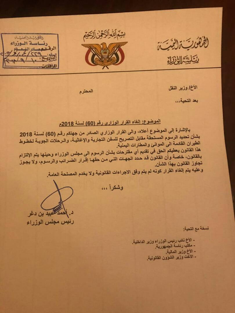 حيث تحوي الوثيقة الموزعة قرار من رئيس الوزراء بإلغاء قرار وزير النقل رقم (60) لسنة 2018م ,بشان تحديد الرسوم المستحقة مقابل التصريح للسفن التجارية والاغاثية والرحلات الجوية لخطوط الطيران القادمة الى موانئ والمطارات اليمنية .