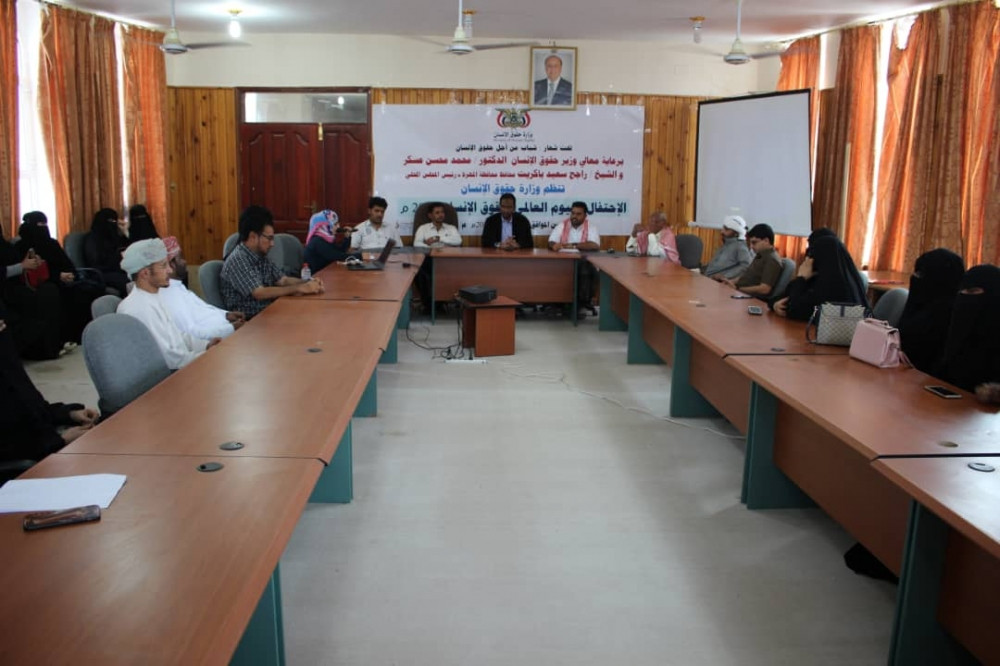 نظم مكتب وزارة حقوق الإنسان بمحافظة المهرة أمس الاثنين،احتفالية بمناسبة اليوم العالمي لحقوق الإنسان تحت شعار " شباب من أجل حقوق الإنسان " برعاية وزير حقوق الإنسان ومحافظ المهرة و بحضور وكيل أول المحافظة الأستاذ مختار محمد بن عويض الجعفري وعدد من مدراء عموم المكاتب التنفيذية وممثلي منظمات المجتمع المدني.