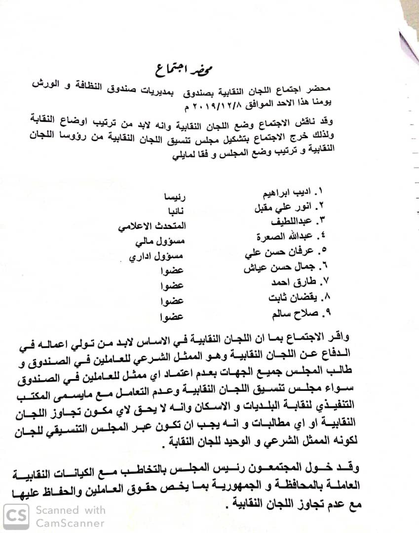 عقد ، يوم الأحد الماضي ، الموافق 8 / 12 / 2019م ، إجتماع اللجان النقابية لصندوق النظافة في مديريات محافظة عدن والورش والإدارة العامة ، كرس لمناقشة وضع اللجان النقابية وترتيب أوضاعها .