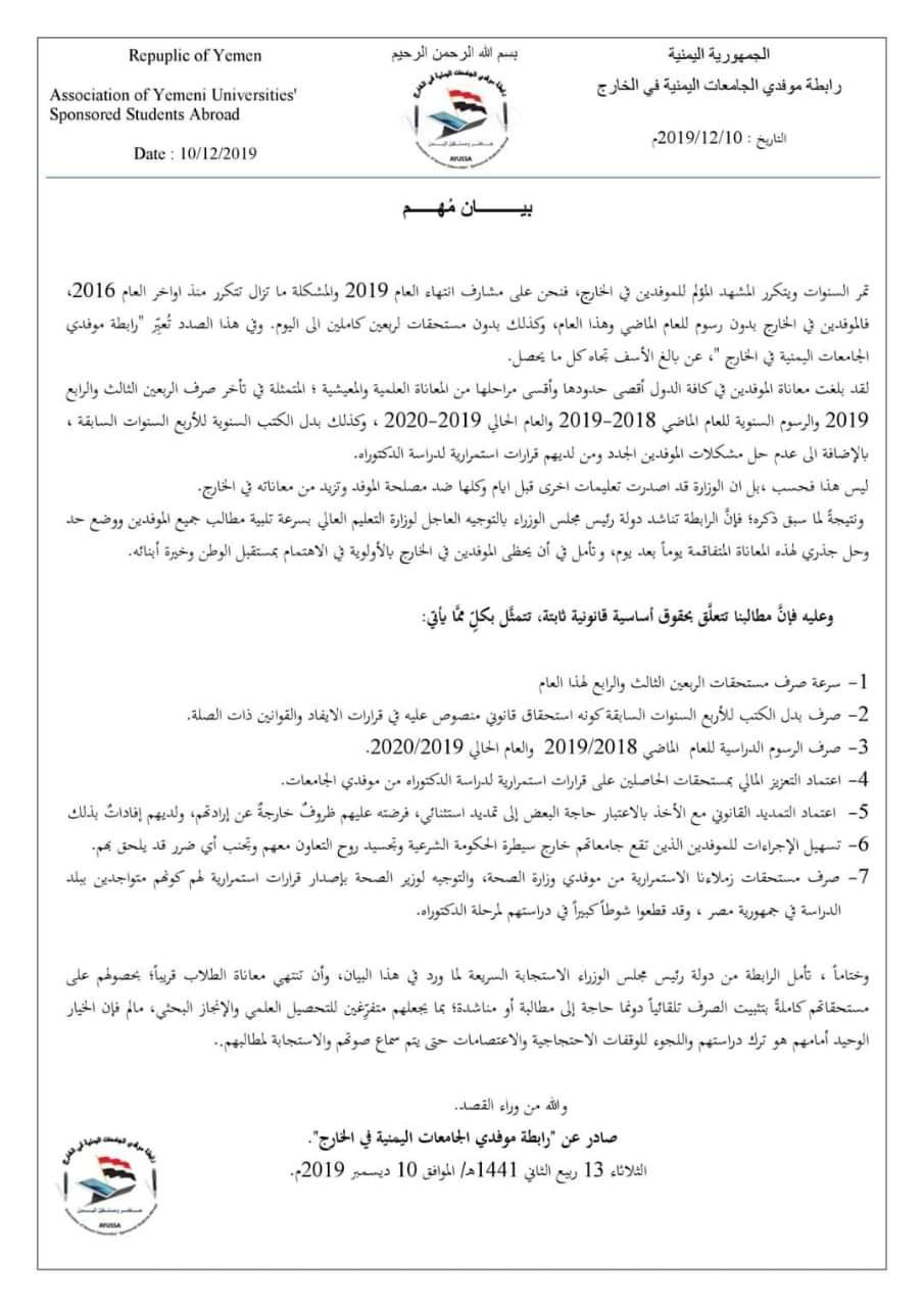 وجاء في البيان ايضا لقد بلغت معاناة الموفدين في كافة الدول أقصى حدودها وأقسى مراحلها من المعاناة العلمية والمعيشية ؛ المتمثلة في تأخر صرف الربعين الثالث والرابع 2019 والرسوم السنوية للعام الماضي 2018-2019 والعام الحالي 2019-2020 ، وكذلك بدل الكتب السنوية للأربع السنوات السابقة ، بالإضافة الى عدم حل مشكلات الموفدين الجدد ومن لديهم قرارات استمرارية لدراسة الدكتوراه.
