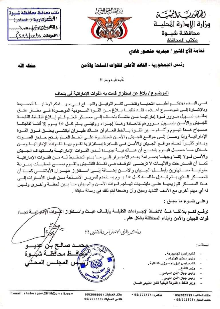 بعث محمد صالح بن عدوي محافظ محافظة شبوة برسالة الى الرئيس هادي موضحا لأعمال عدائية تقوم بها الإمارات ضد الجيش الوطني بمحافظة شبوة مطالبا بضرورة اتخاذ اجراءات كفيلة بإيقاف تلك الاستفزازات.