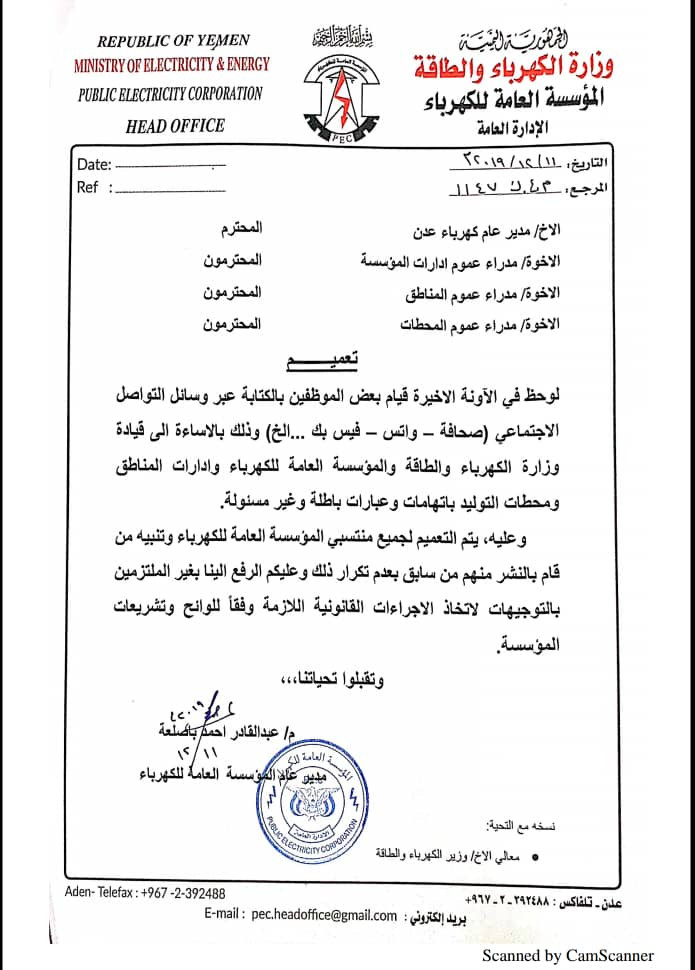 اصدرت المؤسسة العامة للكهرباء بيانا بشأن قيام عددا من الموظفين بالاساءة الى قيادة الوزارة في مواقع التواصل الاجتماعي .