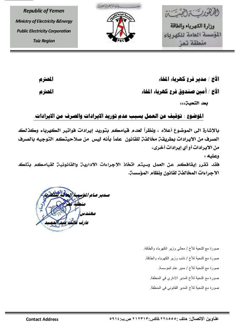 اصدر مدير كهرباء تعز المهندس عارف عبدالحميد امر توقيف بحق مدير فرع كهرباء مديرية المخا وذالك على خلفية مخالفات للقانون حد الوثيقة المسربة التي حصل كريتر سكاي على نسخة منها.