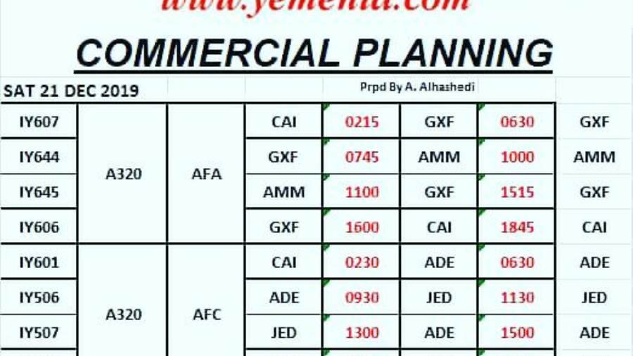 رقم الرحله : 601. خط الرحله : القاهره- عـدن. الاقلاع : 0230 بعد منتصف الليل. (توقيت القاهره) الوصول : 0630 صباحا.