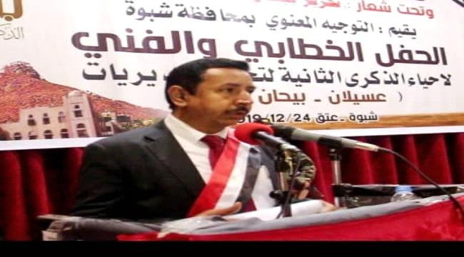 واشار في كلمة له صباح اليوم في مهرجان الذكرى الثانية لتحرير بيحان ان شبوة انتصرت لمشروعها الوطني العظيم .