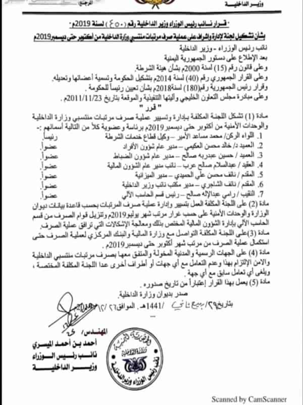 أصدر نائب رئيس مجلس الوزراء وزير الداخلية المهندس أحمد بن أحمد الميسري قرارا رقم ٤٥٠ لسنة ٢٠١٩م بشأن بشأن تشكيل لجنة لإدارة وإشراف على عملية صرف مرتبات منتسبي وزارة الداخلية من أكتوبر حتى ديسمبر ٢٠١٩م.