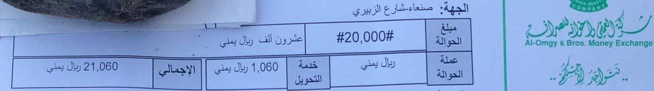 ولفت بالقول حيث بلغ قيمة تحويل٢٠ الف ريال يمني اليوم من عدن إلى صنعاء أكثر من ألف ريال لأول مرة بينما لايتطلب قيمة تحويل٥٠ الف إلى المكلا ب٣٠٠ريال لدى شركة العمقي أوالكريمي وبقية شركات الصرافة بذريعة إرتفاع سعر الرسوم المفروضة على التحويلات المالية.