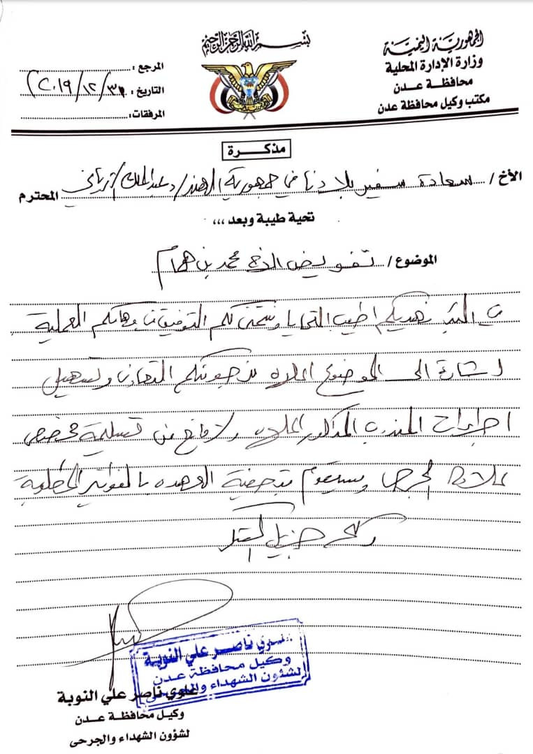وبعد صدور تفويض من وكيل الجرحى والشهداء في إقليم عدن المهندس علوي النوبه إلى مندوب الجرحى محمد بن همام بورقة رسمية رفضت السفارة اعطاء المبالغ إلى المندوب وتعمدة عرقلة التسليم للمرة الثانية على التوالي.