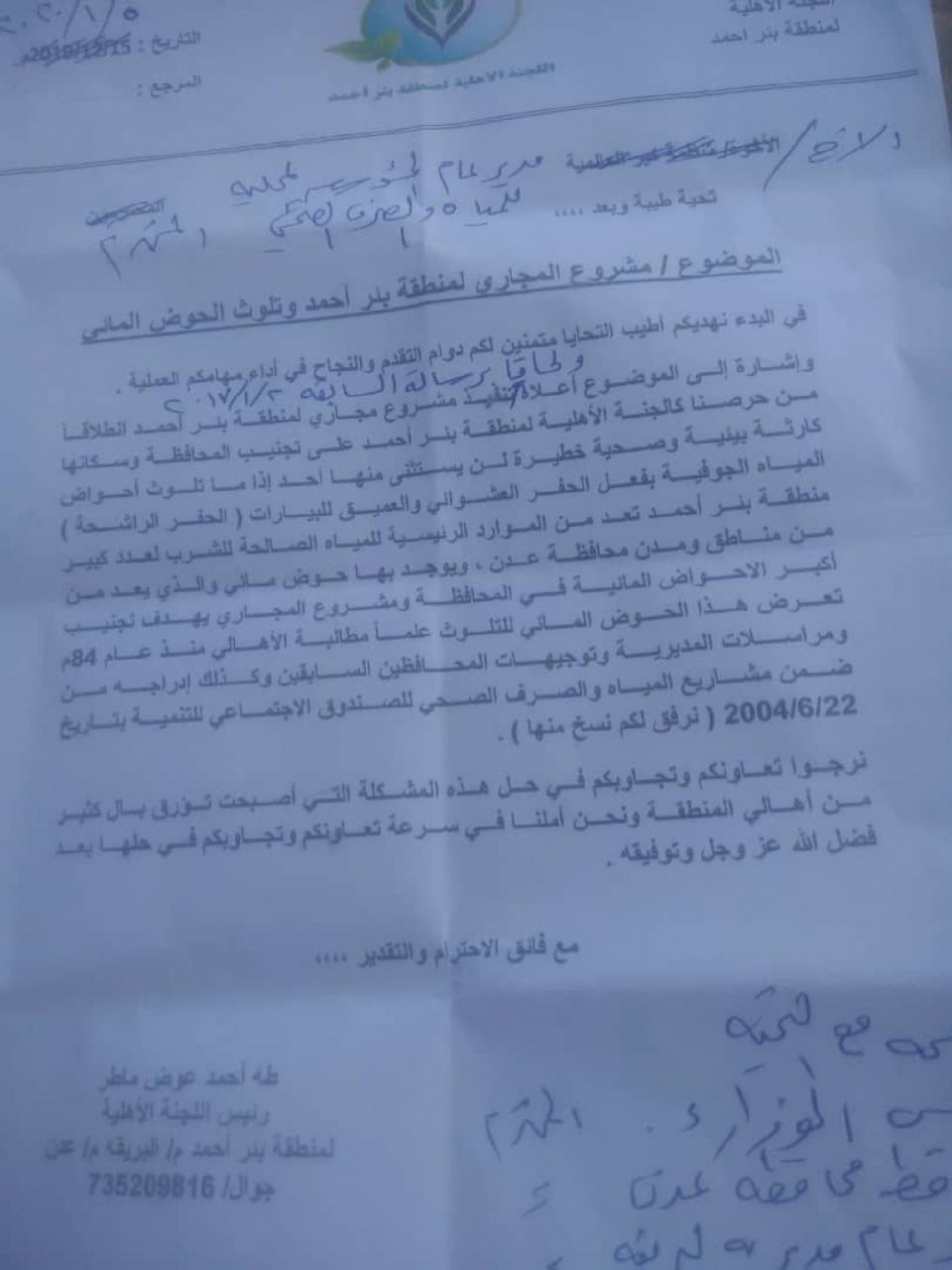 ناشد أهالي وسكان منطقة بئر أحمد بمديرية البريقة محافظة عدن المنظمات الدولية ( وخصوصاً صديقة البيئة) الى التدخل العاجل لمعالجة أهم القضايا الخدمية والتي تتعلق بتلوث الحوض المائي لمشاريع مياه الشرب .