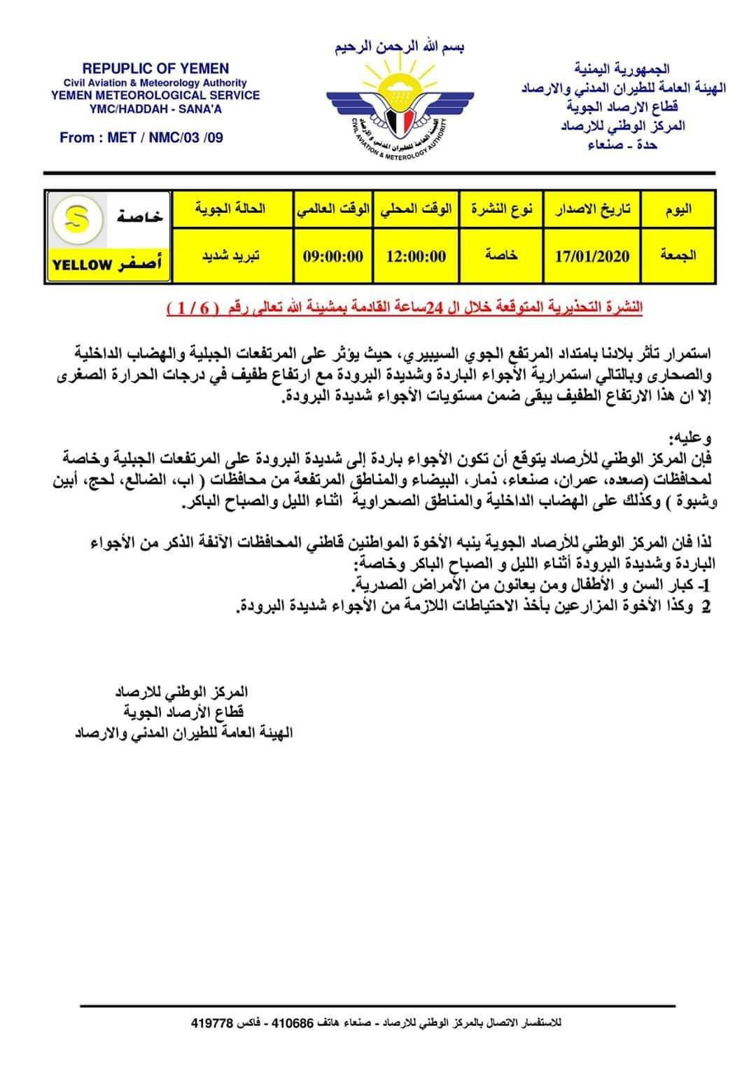 اكدت الارصاد اليمنية استمرار موجة الصقيع والبرودة الشديدة على المرتفعات الجبلية والهضاب الداخلية والصحاري مع ارتفاع طفيف في درجات الحرارة .