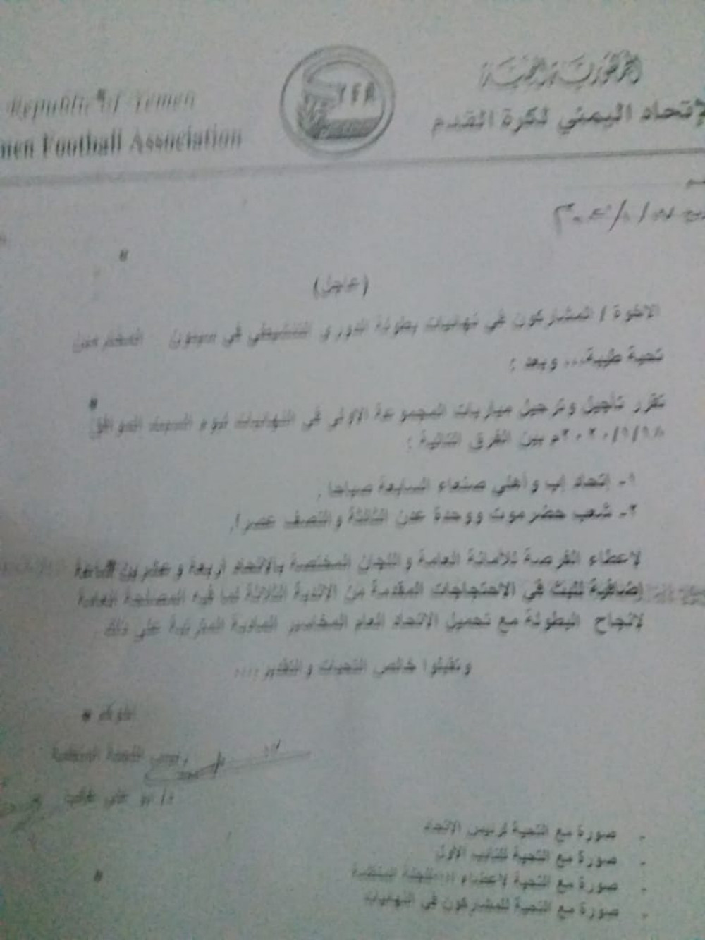 أقرت لجنة المسابقات بإتحاد كرة القدم تأجيل مباريات الجولة الثالثة من الدوري التنشيطي والذي يقام حاليا في مدينة سيئون.
