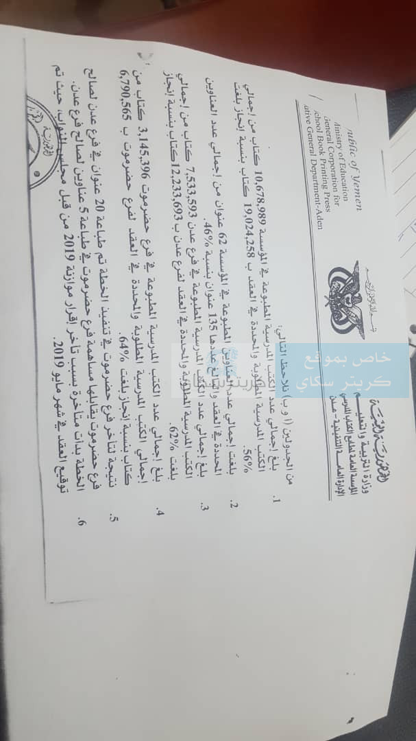 واضاف باسليم من خلال مؤتمرا صحافيا عقده قبل لحظات في عدن: بالانتاج تجاوزنا فرع صنعاء وصرفت الحكومية ٤ مليار كموازنة لوزارة التربية والتعليم لطباعة الكتاب المدرسي( ١١ مليون كتاب).