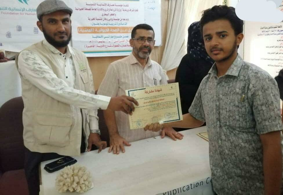 وفي الحفل الختامي للدورة التدريبية تم تكريم المشاركين في الدورة شهائد مشاركة من مؤسسة معارف الإنسانية التنموية والادارة العامة للصحة الحيوانية ومؤسسة روابي ردفان للتنمية .