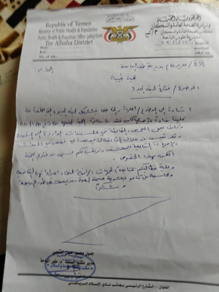 في ظل ما ينشر من شايعات على مستوى التواصل الإجتماعي لغرض يجهله الكثير مما يرتادوا على عملية التواصل الإجتماعي وجة مدير مكتب الصحة والسكان مديرية طورالباحة الدكتور جميل محمود مذكرة موجهه الى مديرعام مديرية طورالباحة الاستاذ عبدالرقيب البكيري.