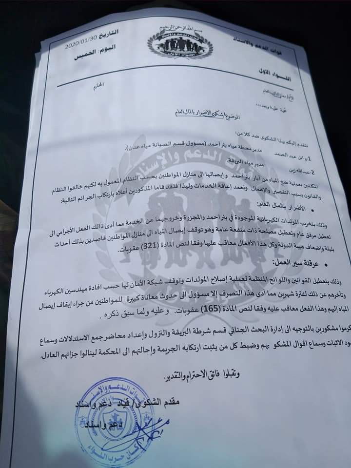 واختتم هناك الكثير من قضايا الفساد في مياة عدن سنقوم بالكشف عنها في الوقت المناسب ولكن ذكرنا لهذه القضيه فقط وهؤلاء الاشخاص بسبب وجود الدلائل الدامقه والبراهين القطعيه التي تثبت تورطهم في هذه القضيه بشكل كبير جدا.مردفا من هنا نناشد جهات الاختصاص ومنظمات المجتمع المدني والرأي العام الجنوبي الاهتمام بهذه القضيه ومتابعتها لكي نوقف كل فاسد عند حده مع محاسبته حسب النظام والقانون.