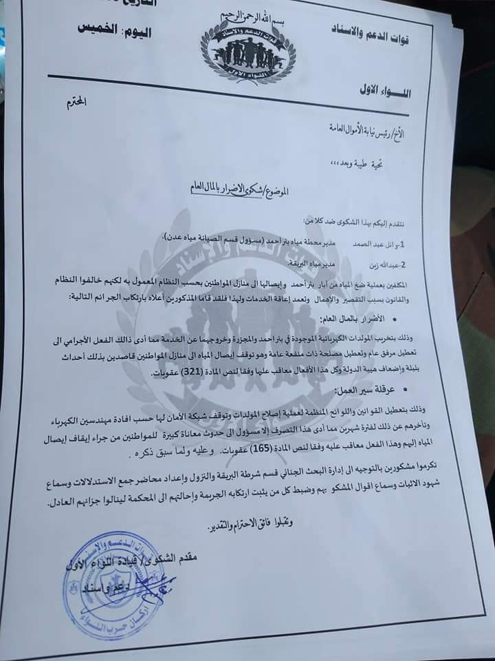 كشف معين المقرحي اركان حرب اللواء الاول دعم واسناد في منشور على حائطه بالفيسبوك تابعه كريتر سكاي عن فساد كبير في مياه عدن وان ملف القضية تم احالته الى القضاء.