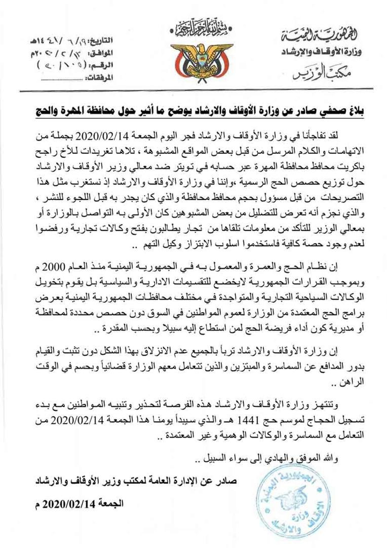 لقد تفاجأنا في وزارة الأوقاف والارشاد فجر اليوم الجمعة 14/02/2020 بجملة من الاتهامات والكلام المرسل من قبل بعض المواقع المشبوهة ، تلاها تغريدات للأخ راجح باكريت محافظ محافظة المهرة عبر حسابه في تويتر ضد معالي وزير الأوقاف والارشاد حول توزيع حصص الحج الرسمية ،وإننا في وزارة الأوقاف والارشاد إذ نستغرب مثل هذا التصريحات من قبل مسؤول بحجم محافظ محافظة والذي كان يجدر به قبل اللجوء للنشر ، والذي نجزم أنه تعرض للتضليل من بعض المشبوهين كان الأولى به التواصل بالوزارة أو بمعالي الوزير للتأكد من معلومات تلقاها من تجار يطالبون بفتح وكالات تجارية ورفضوا لعدم وجود حصة كافية فاستخدموا اسلوب الابتزاز وكيل التهم ..