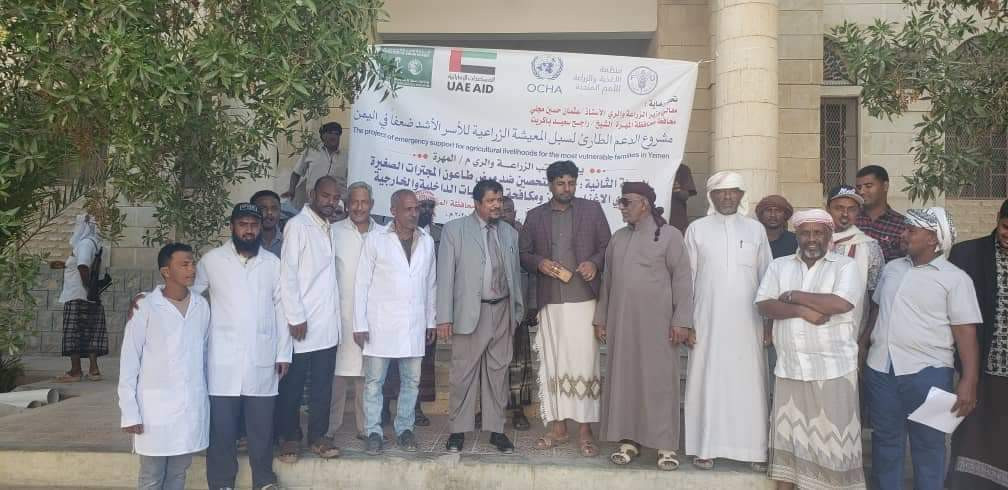 وينفذ المشروع بمحافظة المهرة منظمة الأغذية والزراعة للأمم المتحدة، بالتنسيق مع مكتب الزراعة بالمحافظة، بتمويل من OCHA ومركز الملك سلمان للإغاثة والأعمال الإنسانية والمساعدات الإمارات.