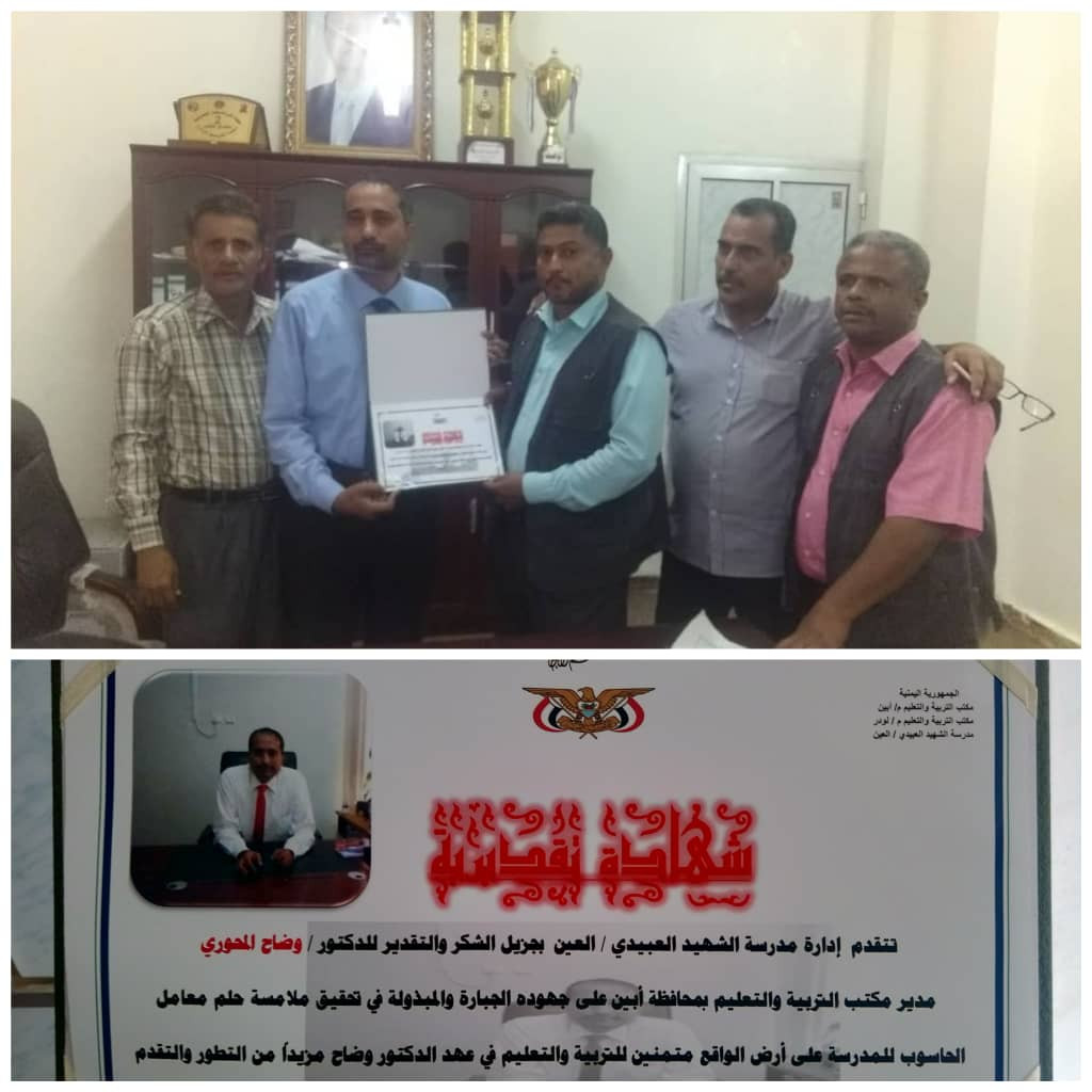 تم صباح اليوم الثلاثاء 18 فبراير بمكتب التربية والتعليم محافظة أبين بمدينة زنجبار تسليم شهادة تقديرية مقدمة من إدارة مدرسة الشهيد العبيدي بالعين ممثلة بمدير المدرسة الاستاذ طلال العولقي.. جاء فيها :- تتفدم إدارة مدرسة الشهيد العبيدي العين مديرية لودر بجزيل الشكر والتقدير للدكتور وضاح المحوري مدير عام مكتب التربية والتعليم محافظة أبين على جهوده الجبارة المبذولة في تحقيق وملامسة حلم معمل الحاسوب للمدرسة على أرض الواقع متمنين للتربية والتعليم في عهد الدكتور وضاح مزيدا من والتطور والتقدم والازدهار