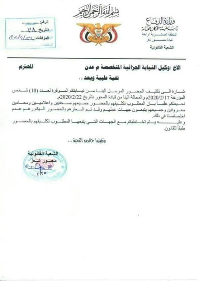 وبعث محور تعز إرسالية رسمية ردا على تكليف وكيل النيابة الجزائية المتخصصة في العاصمة المؤقتة عدن، في تاريخ 2020/2/17، بإحضار العشرة الاعلامين والناشطين المتهمين بالتحريض على تصفية العميد عدنان الحمادي.