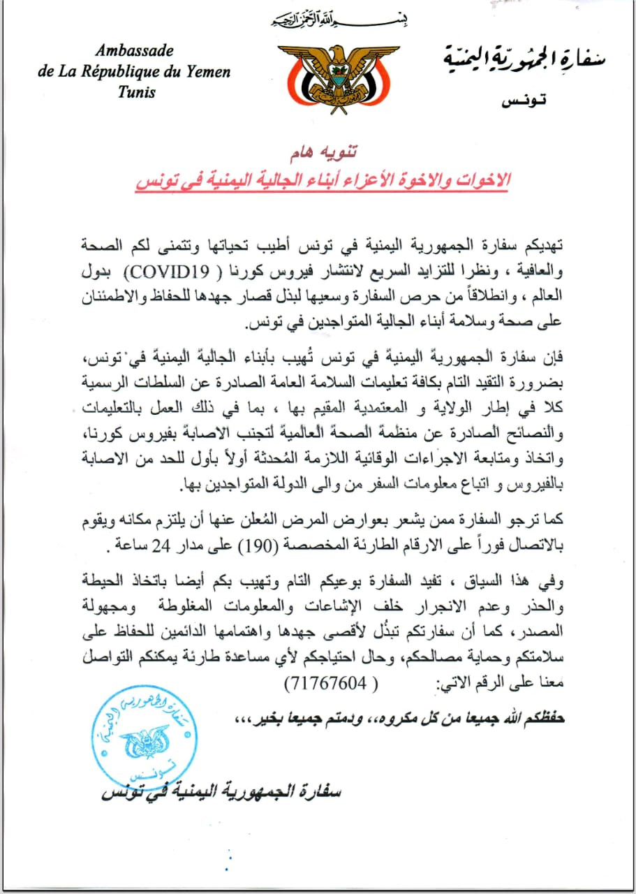 اصدرت سفارة اليمن في تونس تنويها هاما لمواطنيها من ابناء الجالية اليمنية .