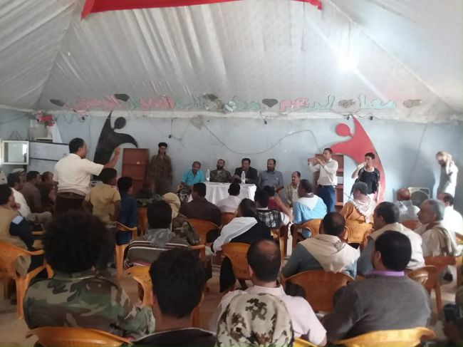 مشائخ وأعيان المديرية أكدو وقوفهم ومساندتهم ودعمهم لقيادة السلطة المحلية ولجميع القرارات الصادرة عنها وللقوات المشتركة والمقاومة والاجهزه الامنيه مؤكدين بانهم سيقفون صفاً واحد ضد الميليشيات الحوثيه وكل من يريد الاخلال بلامن والاستقرار في المناطق المحرره بكل ما أوتوا من قوة حتى تحرير وتطهيركافة المناطق التي تسللت لها ميليشيات الحوثي خلال العام الماضي.