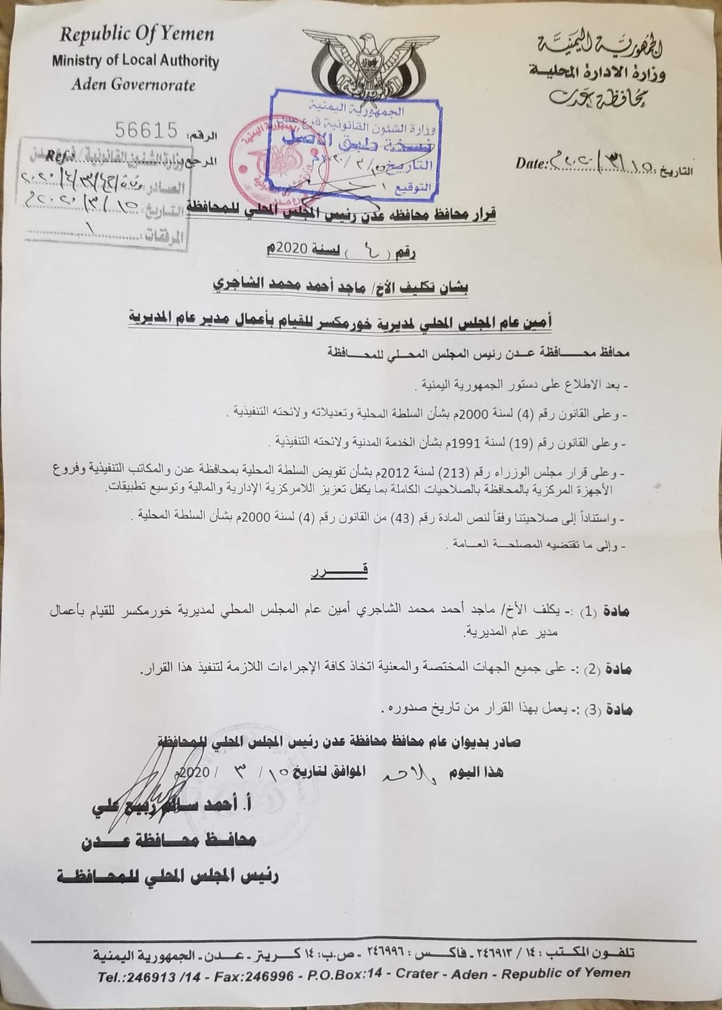 اصدر محافظ محافظة عدن احمد سالم ربيع بتعيين ماجد احمد الشاجري مديرا عاما لادارة السلطة المحلية بخور مكسر .