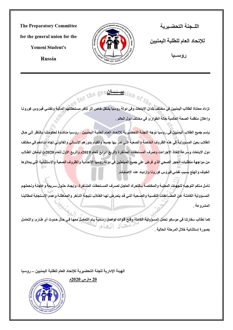 بإسم جميع الطلاب اليمنيين في روسيا توجه اللجنة التحضيرية للإتحاد العام للطلبة اليمنيين - روسيا مناشدة لحكومتنا بالنظر إلى حال الطلاب بعين المسؤولية في هذه الظروف الخاصة والصعبة التي نمر بها جميعاً والقيام بدورهم الإنساني والقانوني تجاه أبناءهم في مختلف دول الإبتعاث وسرعة إتخاذ الإجراءت وصرف المستحقات المتأخرة (الربع الرابع للعام 2019م والربع الاول للعام 2020م) ليتمكن الطلاب من مواجهة متطلبات الحجر الصحي الذي فرض على جميع المبتعثين في دولة روسيا الإتحادية والظروف الصعبة والإستثنائية التي يملاؤها الخوف والهلع بسبب تفشي فيروس كورونا وإزدياد عدد الإصابات.