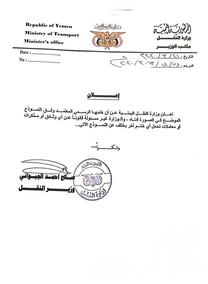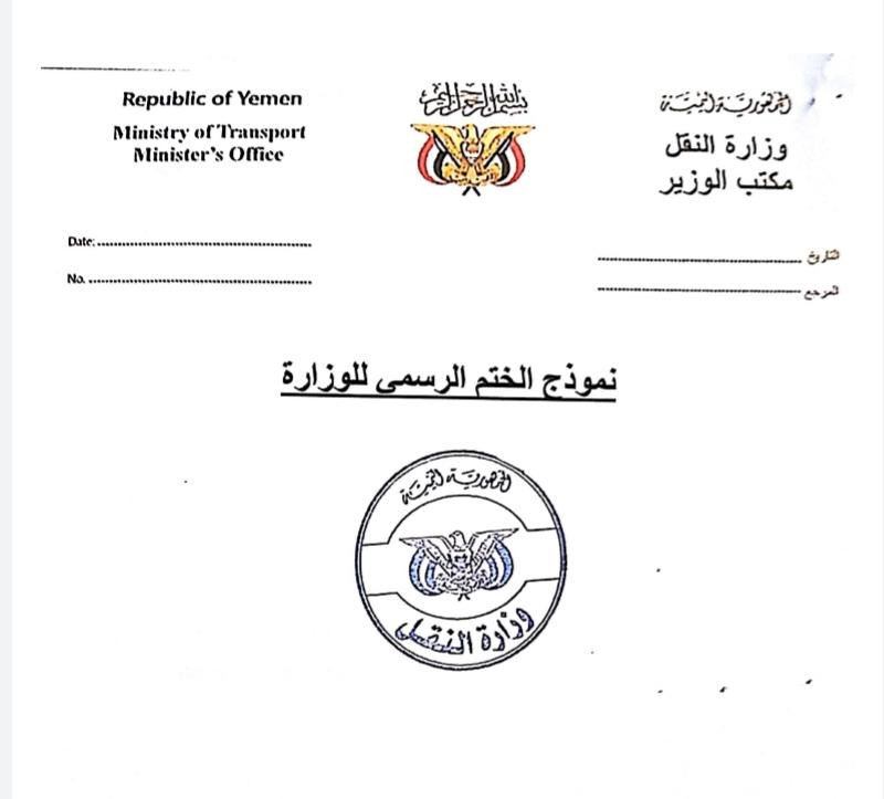 أعلنت وزارة النقل اليمنية في مذكرة خاصة عممت اليوم إلى أن ختمها الخاص هو وفق النموذج الرسمي المعتمد من سابق ومرفق صورة منه
