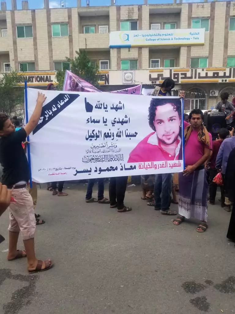 وقال مصدر لكريتر سكاي : أن أبناء تعز نفذوا وقفة احتجاجية قبل قليل في شارع جمال للمطالبة بتسليم قتلة الشاب معاذ محمود.