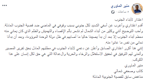 وقال الصحفي والكاتب الشمالي منير الماوري في منشور بصفحته بالفيس بوك :"اعتذار لأبناء الجنوب ",,أقدم اعتذاري وأعرب عن أسفي الشديد لكل جنوبي بسبب وقوفي في الماضي ضد قضية الجنوب العادلة. وأحب التوضيح أنني وكثير من أبناء الشمال لم نشعر بألم الإقصاء والتهميش والظلم الذي كان يعاني منه معظم أبناء الجنوب إلا بعد أن بدأ يصيبنا حاليا ما أصابهم في ظل دولة الوحدة الموؤودة، وبعد أن بدأنا نعاني من نفس ما عانوا منه.