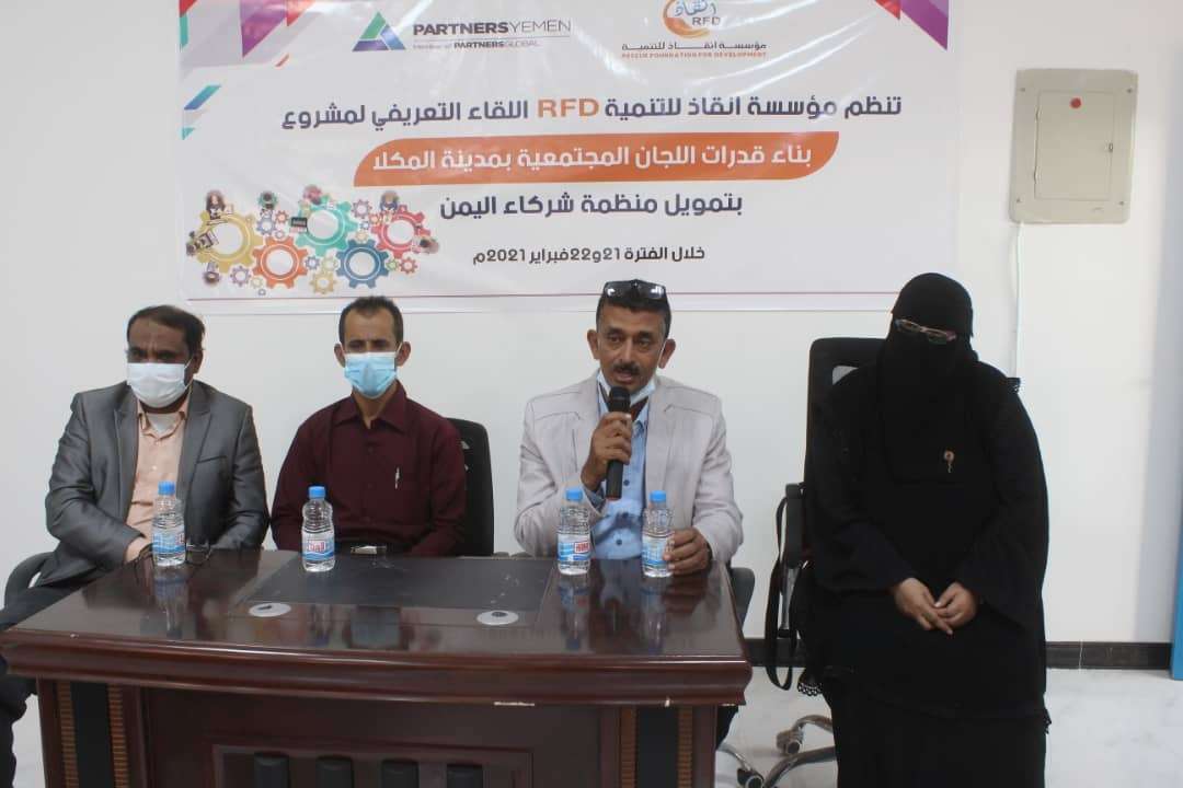 جرى بمدينة المكلا اطلاق مشروع بناء قدرات اللجان المجتمعية بمدينة المكلا، باقامة لقاءً تعريفياً للمشروع الذي يستمر لمدة ثلاثة اشهر، وتنفذه مؤسسة انقاذ RFD بحضرموت، وتموله منظمة شركاء اليمن.