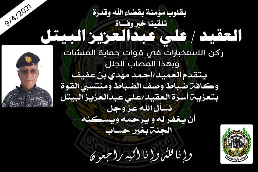 نعت قوات حماية المنشآت الحكومية وفاة العقيد علي عبدالعزيز البيتل ركن الاستخبارات بالقوات إثر اصابته بفيروس كورونا.