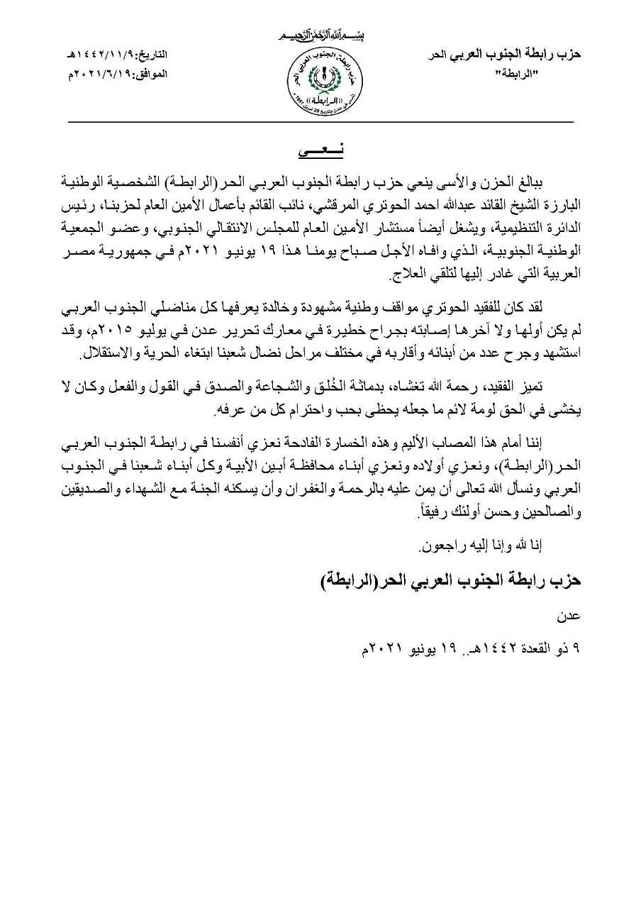 ببالغ الحزن والأسى ينعي حزب رابطة الجنوب العربي الحر الشخصية الوطنية البارزة الشيخ القائد عبدالله احمد الحوتري المرقشي، نائب القائم باعمال الامين العام لحزبنا، رئيس الدائرة التنظيمية، ويشغل ايضا مستشار الامين العام للمجلس الانتقالي الجنوبي، وعضو الجمعية الوطنية الجنوبية، الذي وافاه الأجل صباح يومنا هذا ١٩ يونيو ٢٠٢١م في جمهورية مصر العربية التي غادر اليها لتلقي العلاج.