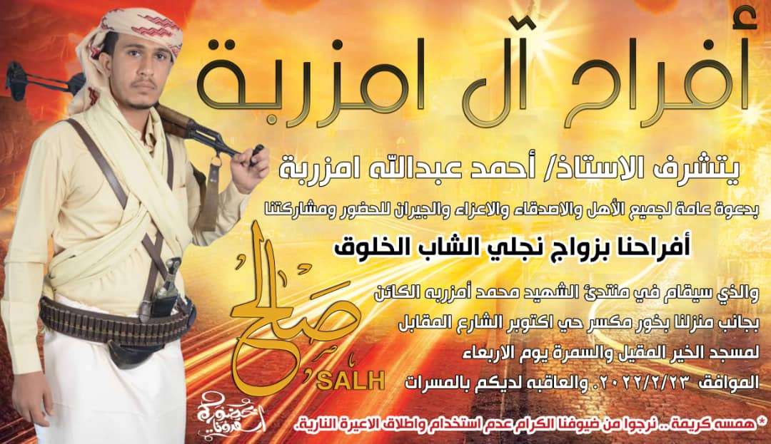 نتقدم باطيب واجمل التهاني للمناضل الجسور احمد عبدالله امزربه بمناسبة زواج نجله الشاب الخلوق صالح ونتمنى له حياة زوجية سعيدة وان يرزقه الباري بالذرية الصالحة.
